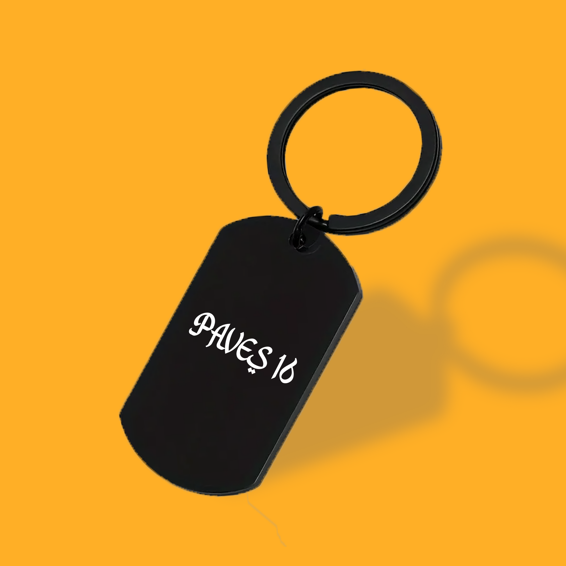 Eleganter Paves 16 Schlüsselanhänger aus Metall in schwarz. Laserdruck des Silhouette-Icon auf der einen Seite, das Paves 16 Logo auf der anderen.