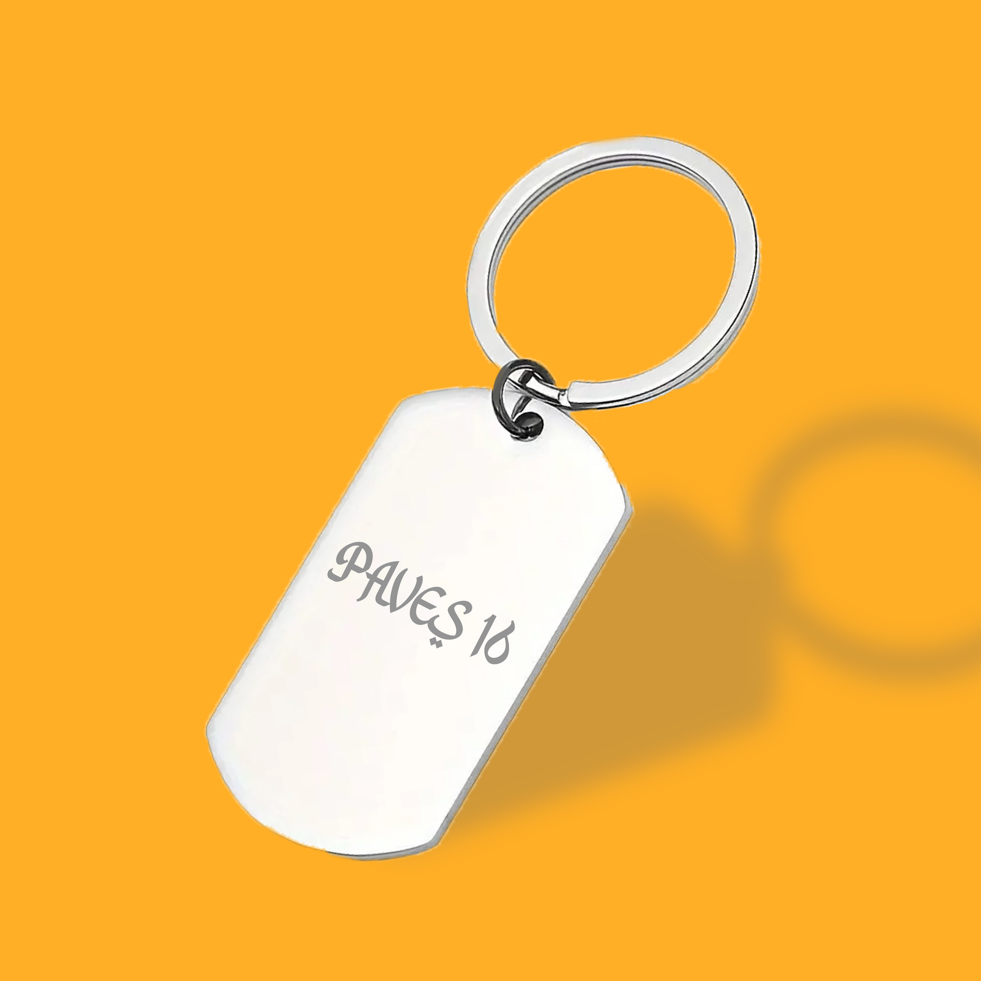 Eleganter Paves 16 Schlüsselanhänger aus Metall in silber. Laserdruck des Silhouette-Icon auf der einen Seite, das Paves 16 Logo auf der anderen.